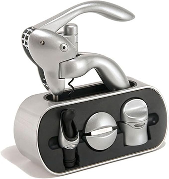- With a Houdini lever corkscrew, wine pourer/stopper, foil cutter, wine/champagne sealer, spare spiral, and tool stand, this set makes a great gift for wine experts and beginners.