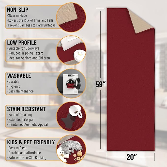 - [KEY ATTRIBUTES]: Size: 20" x 59" (2' x 5') | Thickness: 0.2 in. | Color: Red.Product Note : Rugs may contain temporary creases upon arrival, allow time for creases to flatten and settle