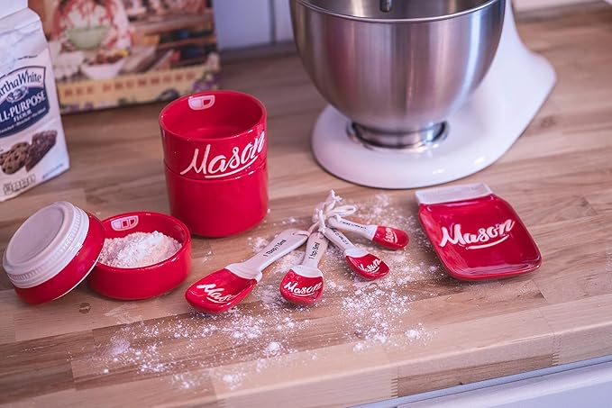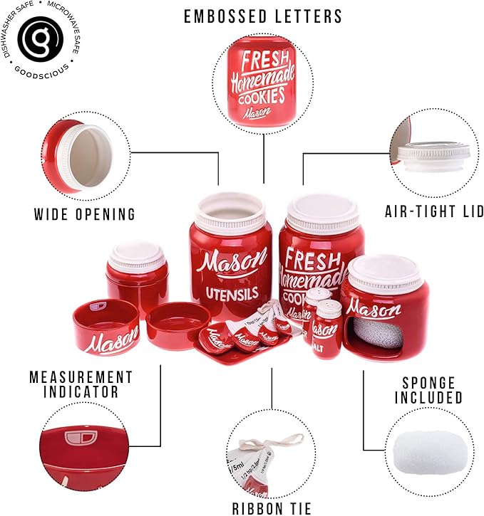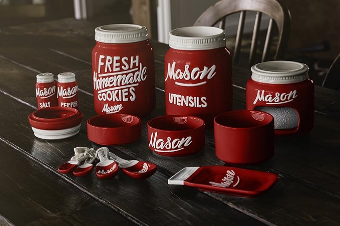 - 🌾 TIMELESS MASON JAR DESIGN: Elevate your kitchen decor with this 17-piece set with spoon holder, utensil rest, kitchen canisters or ceramic canisters, and more featuring a vintage-inspired mason jar design. Perfect for adding a touch of rustic charm to any kitchen, this red canister set is both stylish and functional.