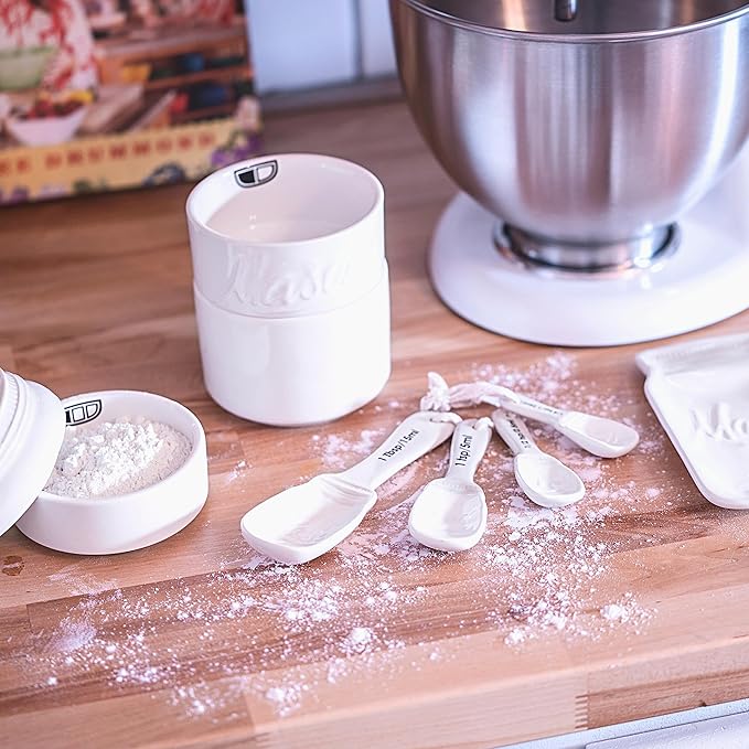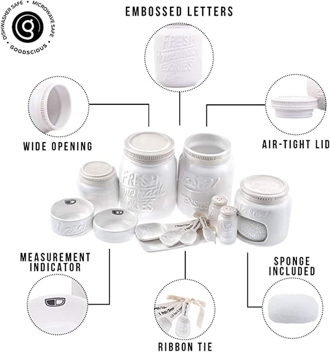 - 🏡 ORGANIZED AND CHIC KITCHEN SPACE: Enhance both functionality and visual appeal in your kitchen with our Mason Jar Kitchenware Set. Featuring 4 measuring cups, 4 measuring spoons, a spoon rest, 2 shakers, a ceramic jar with lid, a utensil holder, and a sponge holder for the kitchen sink counter, this set blends practicality with cozy charm. You will receive (1) Mason Jar Ceramic Set with 17 pcs White kitchen accessories.