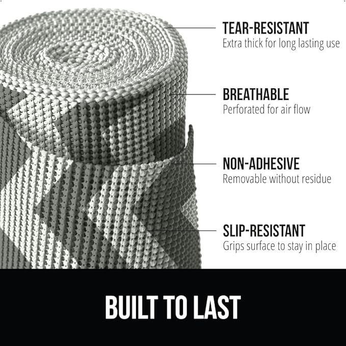 - EXTRA STRONG GRIP NON-ADHESIVE LINER: the Gorilla Grip powerGRIP liner is a non adhesive and tear resistant liner engineered with the highest quality materials to reduce slipping and bunching in your drawers or cabinet shelves; superior gripping technology keeps both the liner in place on surfaces