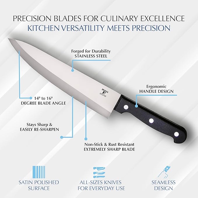- Easy Slicing And Dicing: Moss & stone is pleased to offer the best kitchen knives for the perfect cutting experience. Our stainless steel kitchen knife set with scissors makes cutting, chopping, slicing, and dicing easier, emphasizing your safety to prevent work accidents.