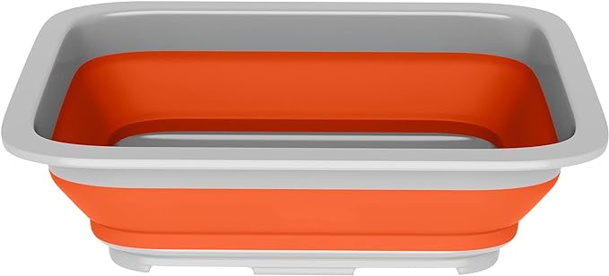 - PRODUCT DETAILS - Materials: Plastic and Plastic Rubber. Dimensions: (L) 14.75" x (W) 10.75" x (H) 5"; Collapsed: (H) 2". Maximum Capacity: 7.27-Liters. Color: Orange.