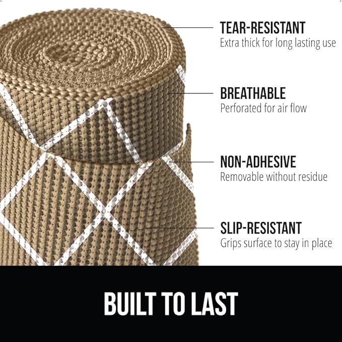 Gorilla Grip powerGRIP Drawer Shelf and Cabinet Liner, Thick Strong Hold, Non-Adhesive Liners Protect Kitchen Cabinets and Cupboard, Bathroom Drawers, Easy Install, Breathable Mat, 17.5" x30', Beige