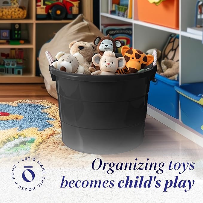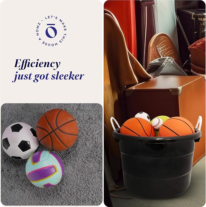 Homz 18 Gallon Plastic Multipurpose Utility Storage Bucket Tub with Strong Rope Handles for Indoor and Outdoor Use, Black, (2 Pack)