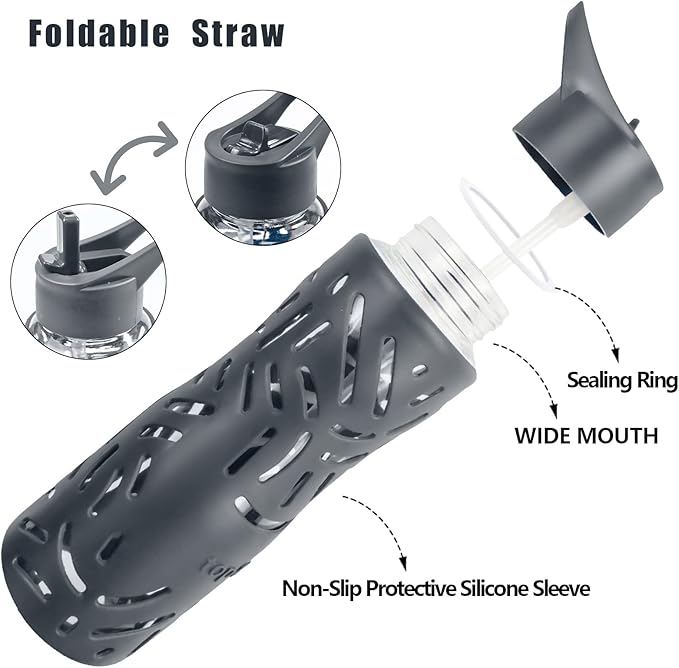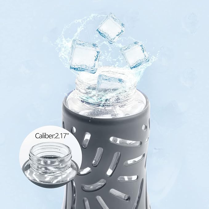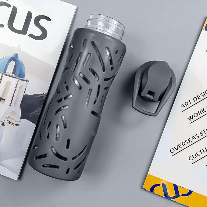 25oz Glass Water Bottles with Silicone Sleeve, 3 Different Lids (BPA Free) for Wide Mouth Glass Drink Bottles for Fitness and Outdoor (Grey)