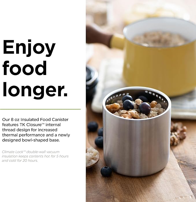 - Insulated Performance: The Klean Kanteen food container has a Climate Lock double-wall vacuum insulation that keeps contents hot for 5 hours and cold for 20 hours