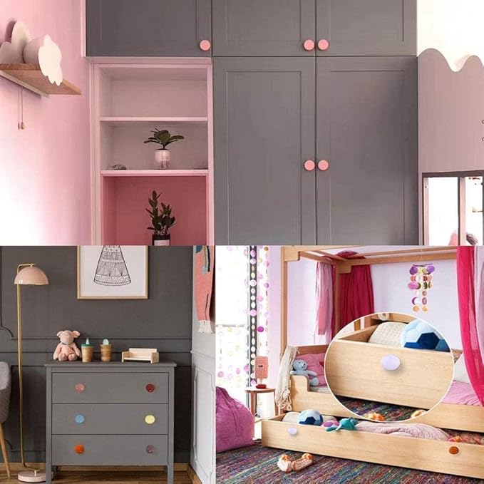 - Set of 10pcs delicate round door knobs of different colors, ideal for cabinet, drawer, bin, chest of drawers, wardrobe, etc. Made of durable hard ceramic material, robust and sturdy, not easy to come apart. The round kid’s cabinet knobs have fine touch, glossy and smooth surface, lovely bright multi-colors and definitely are great choice for children’s room decoration.