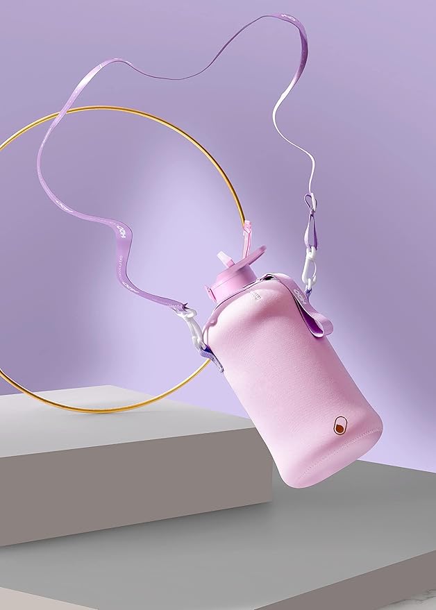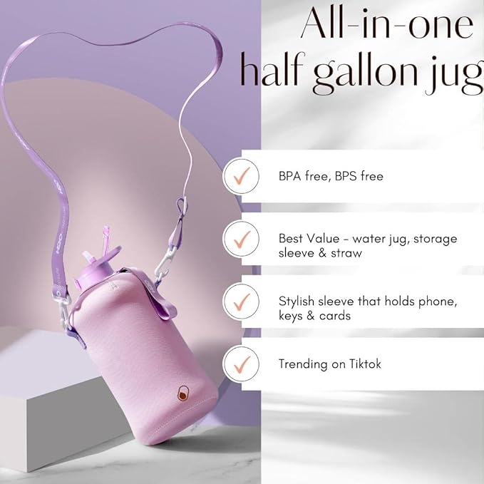 - UNIQUE STORAGE SLEEVE: Using the space under the large jug handle to store your stuff, the patent-pending removable thermal sleeve has a unique design that holds your cards and cell phone, and is finished with an in-built key chain and removable shoulder strap for convenient hands free carrying! It’s the only encased water jug that holds your things while you exercise.