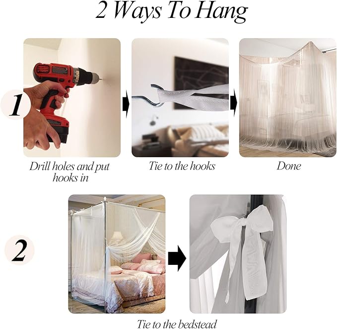 - ๐๐ฎ๐๐ ๐๐ป๐๐๐ฎ๐น๐น - with 2 WAYS TO SET UP: You can install the canopy easily into the ceiling with the provided 4 hooks and wall plugs OR hang it from the corners of your four-post bed for an added touch of style and elegance.