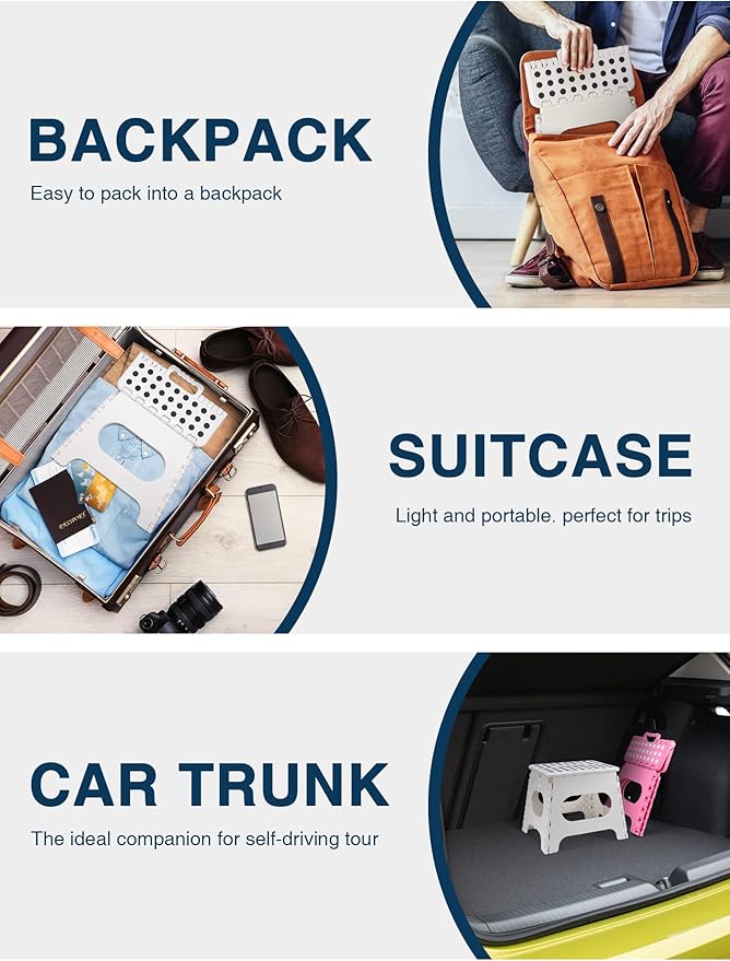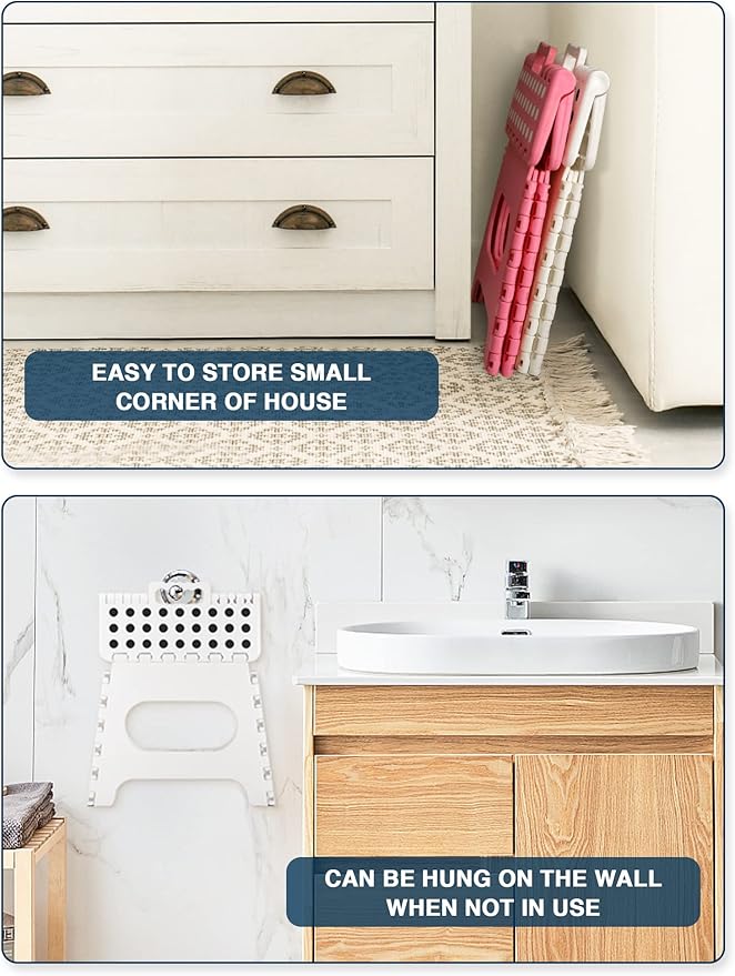- [✅️Anti Slip Rubber Base ✅️] - Special rubber dots on the kitchen step stool surface and anti-slip black rubber strap on each foot for maximum foot grip and gives amazing comfort, preventing slippage. Unique and grip-dot textured surface make the portable step stool safe for everyone. Ideal for Kids, Children and Adults.