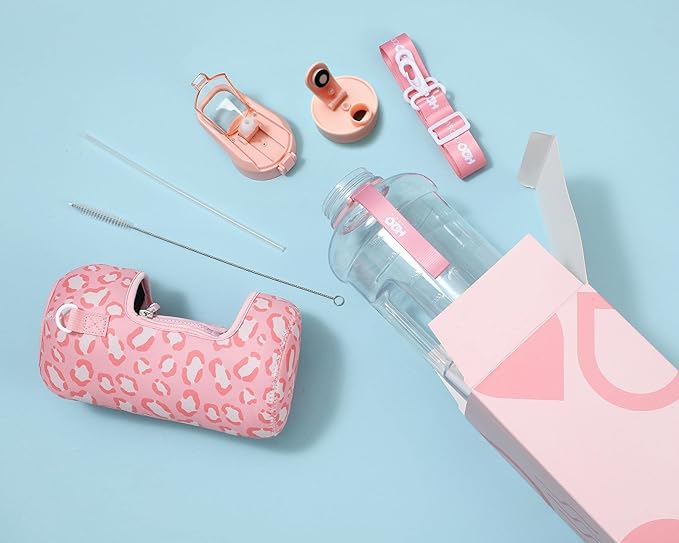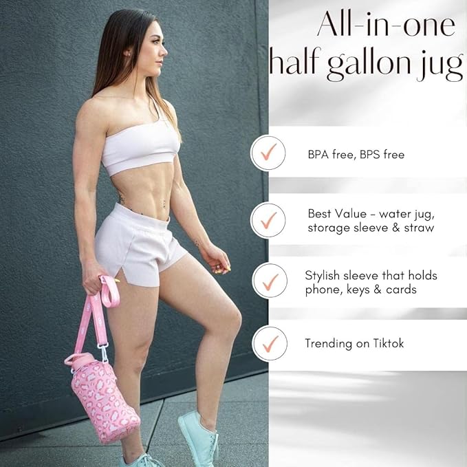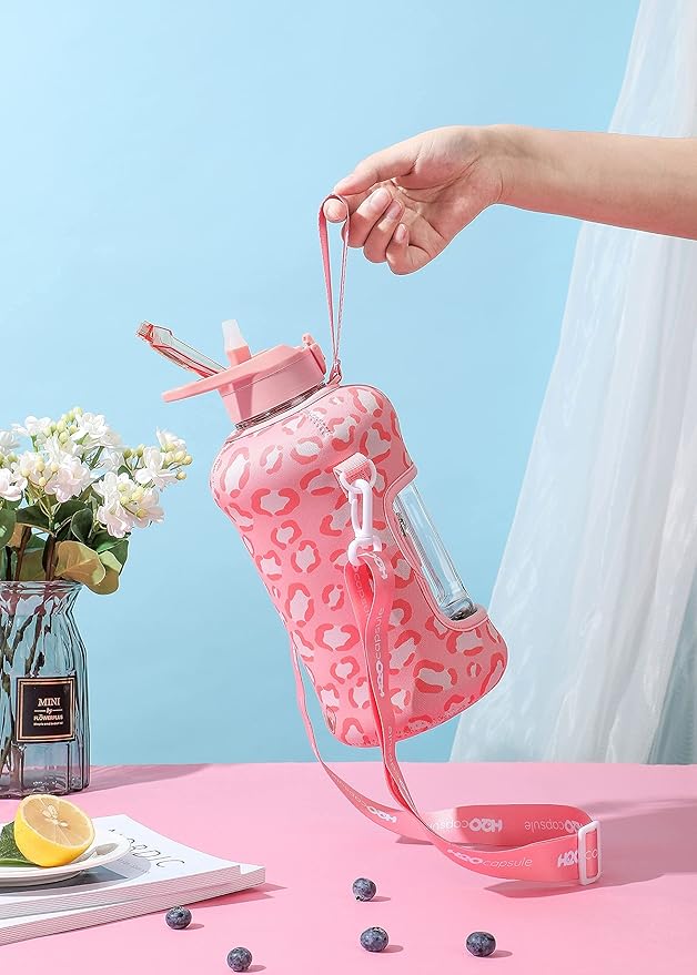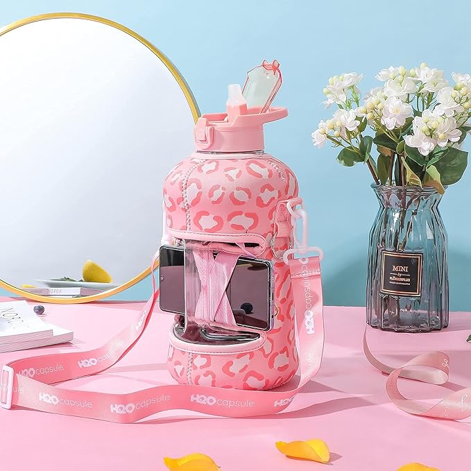 - HALF GALLON HYDRATION WITH COVERED STRAW LID: The extra large pink 2.2L / 74 oz plastic jug holds all the water you need to stay hydrated while you exercise. The reusable half gallon comes with a leak-proof & dust-proof covered straw lid, which helps protect the mouthpiece and flips open with a click of a button. The straw-lid is air-sealed: Run straw brush through mouth piece before initial use. The H2O Capsule bottle with storage sleeve comes with a bonus straw cleaning brush.