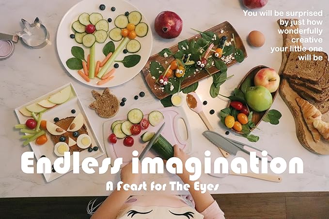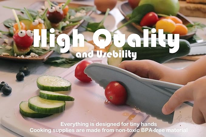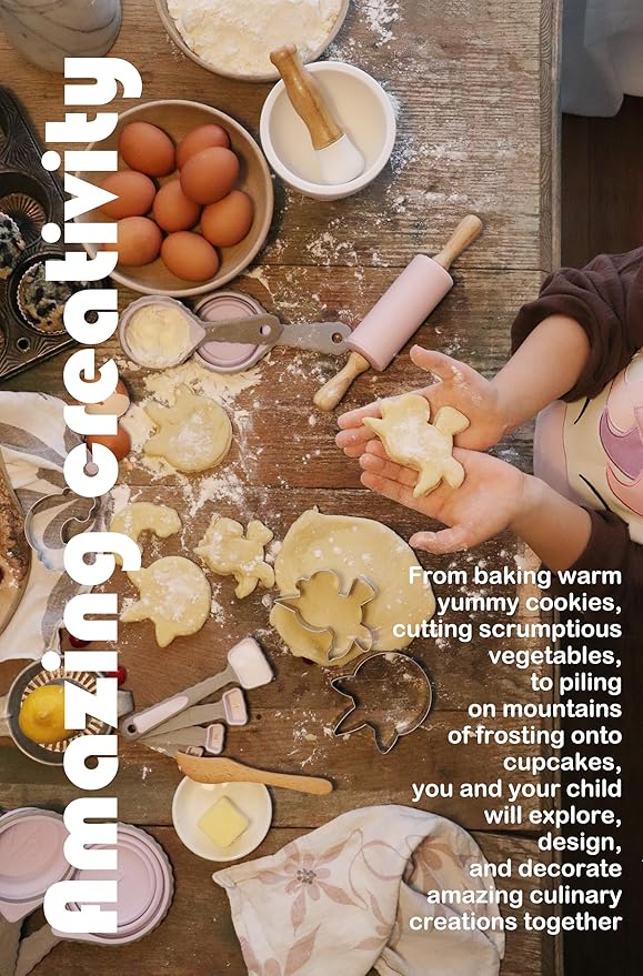 - 🧁 EDUCATIONAL AND SKILL-BUILDING: Squeezing gooey dough and mixing sweet, delicious batter help with learning and skill development. Therefore, we chose materials excellent for facilitating sensory learning. Included are silicone utensils with wooden handles, stainless-steel cookie cutters, working knives in 3 sizes, and collapsible silicone measuring cups.