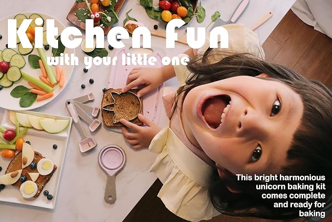 - 🧁 KITCHEN FUN FOR YOUR LITTLE ONE: This bright harmonious unicorn baking kit comes complete and ready for playful, imaginative fun. From baking warm yummy cookies, cutting scrumptious vegetables, to piling on mountains of frosting onto cupcakes, you and your child will explore, design, and decorate amazing culinary creations together.