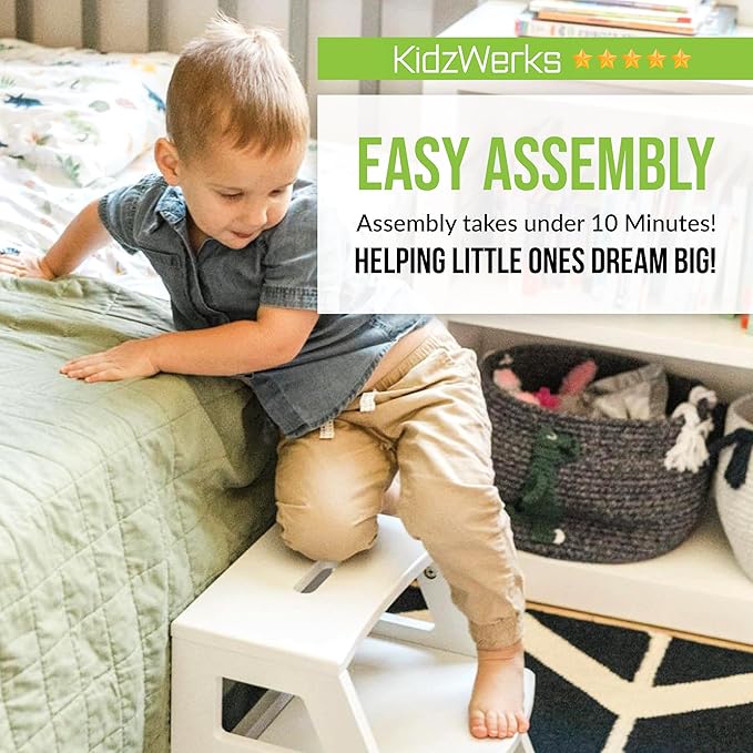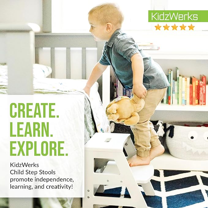 - STEP STOOL FOR KIDS – KidzWerks Child Step Stool is the perfect toddler step stool for bathroom sinks and kitchen counters. It helps children access the surfaces easily.