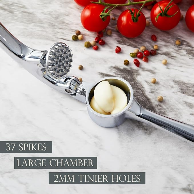 - Maximal Amount & Minimal Pressure - The garlic press has 37 small spikes that match up with the holes in the chamber ideal for maximizing efficient of garlic pressed, whether the unpeeled or peeled cloves, easily crush each clove and push the garlic through fine holes to produce a ready-to-use paste, while the peels conveniently remain inside the inner chamber