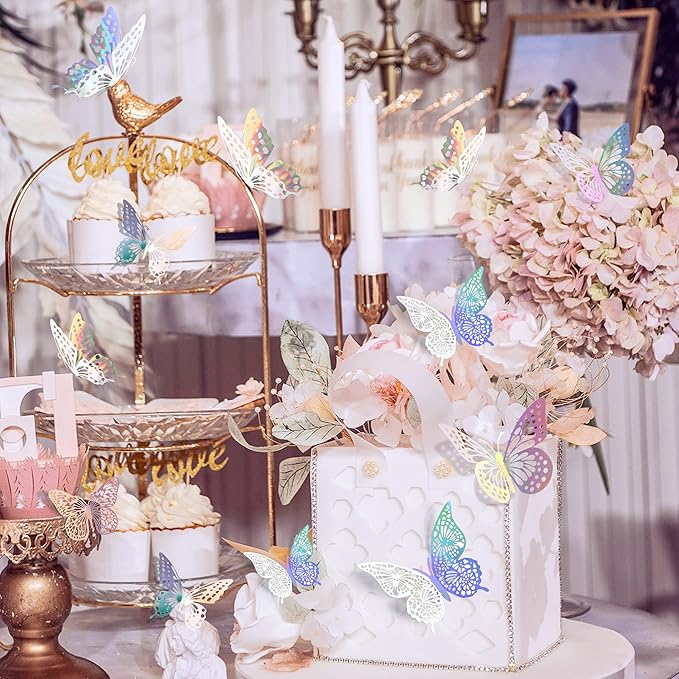 SAOROPEB 3D Butterfly Wall Decor 48 Pcs 4 Styles 3 Sizes, Butterfly Birthday Decorations Butterfly Party Decorations Cake Decorations, Removable Stickers (Laser)