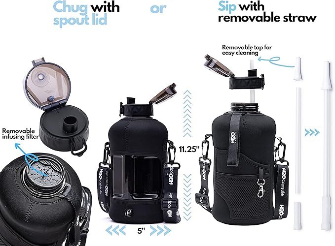 - HALF GALLON HYDRATION WITH REMOVABLE STRAW: The extra large 2.2L / 74 oz hydro jug holds all the water you need to stay hydrated while exercising. The reusable jug has a 2.25” wide mouth perfect for ice cubes, and removable straw for easy drinking.