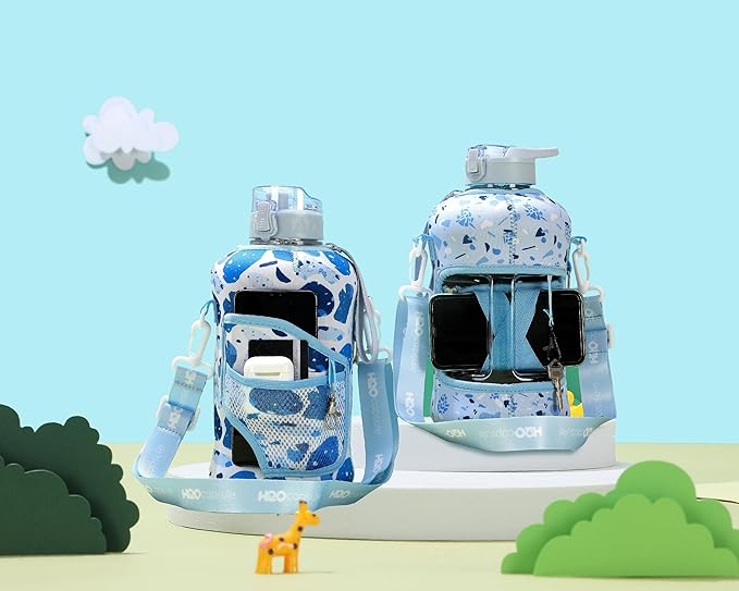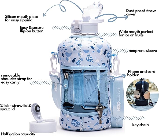 - HALF GALLON HYDRATION WITH COVERED STRAW LID: The extra large 2.2L / 74 oz plastic jug holds all the water you need to stay hydrated while you exercise. The reusable half gallon comes with a leak-proof & dust-proof covered straw lid, which helps protect the mouthpiece and flips open with a click of a button. The straw-lid is air-sealed: Run straw brush through mouth piece before initial use. The H2O Capsule bottle with storage sleeve comes with a bonus straw cleaning brush.
