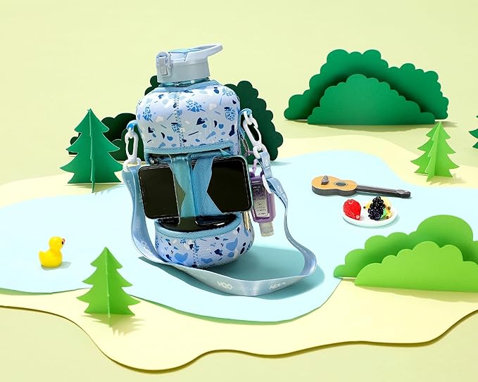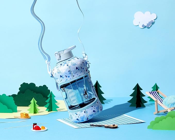 - UNIQUE STORAGE SLEEVE: Using the space under the large jug handle to store your stuff, the patent-pending removable thermal sleeve has a unique design that holds your cards and cell phone, and is finished with an in-built key chain and removable shoulder strap for convenient hands free carrying! It’s the only encased water jug that holds your things while you exercise.