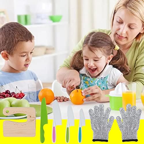 6pcs Kids Wooden and Plastic Knife Set, Kids Safe Knife with Wood Kids Knife Resistant Gloves Cooking Knives Serrated Edges Toddler Knife Kids Plastic Knife for Kitchen Children