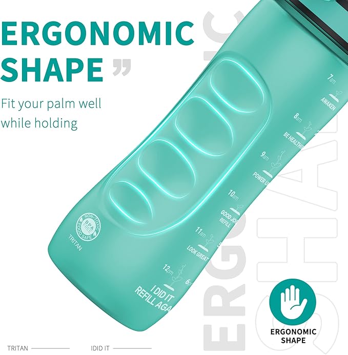 - UNIQUE ANTI-SKID ERGONOMIC SHAPE - The Kitart motivational water bottle is not a straight bottle, instead it has a finger contour for easy grip.