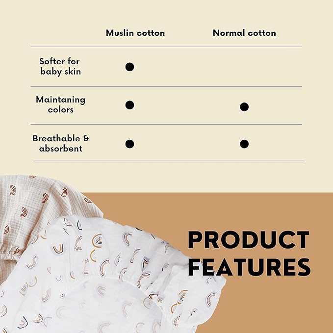 - Comfort & cozy: Keep your little baby from overheating while at the same time providing him/her with a nice comfy “cocoon” created by the muslin-fitted crib sheet. This muslin baby crib sheet will pamper the baby's delicate skin to give him a well-deserved night sleep and enjoy the benefit of the most natural and soothing way of resting. Our muslin crib sheets are specifically designed to match your little baby's needs.