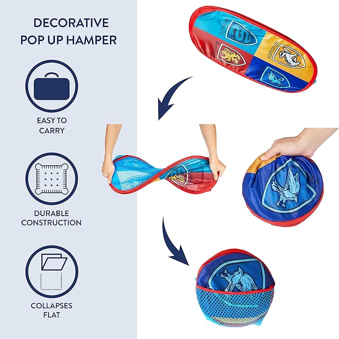- DURABLE CONSTRUCTION: This Hamper is made from nylon fabric and has reinforced handles for easy carrying. An easy light weight hamper to transport around the house. This hamper is made with breathable, polyester mesh sides to complete its design. This Harry Potter Pop Up Kids Hamper is super lightweight. Additionally, this pop up hamper easily folds down and can be stored flat when not in use. This pop up hamper keeps a good shape allowing the hamper to stand upright even when its empty.
