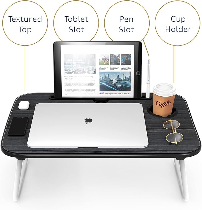 - BONUS LAPDESK: The laptop desk features a cup, pen, and tablet holder so you can keep your stuff neat in one place. The desktop measures 22” x 14.5”. Use it as a laptop workstation, laptop table for bed, a children's bed table, a mini writing table, laptop couch table, or a standing table for office work. It becomes the great balance for relaxing and productivity.