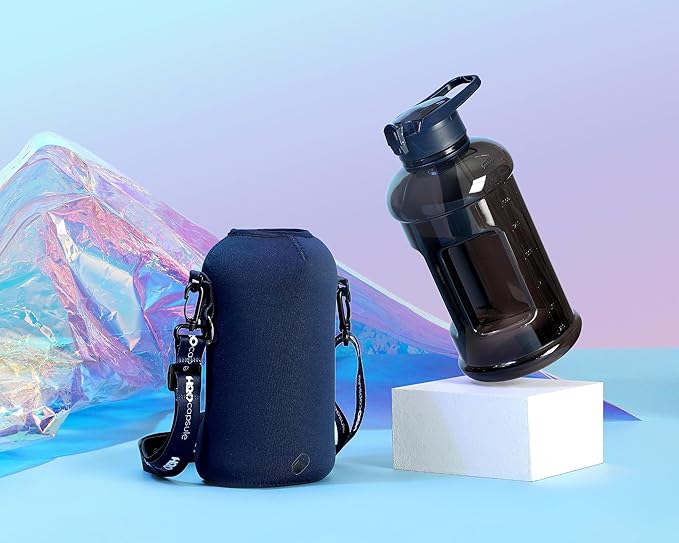 - UNIQUE STORAGE SLEEVE: Using the space under the large jug handle to store your stuff, the patent-pending removable thermal sleeve has a unique design that holds your cards and cell phone, and is finished with an in-built key chain and removable shoulder strap for convenient hands free carrying! It’s the only encased water jug that holds your things while you exercise.