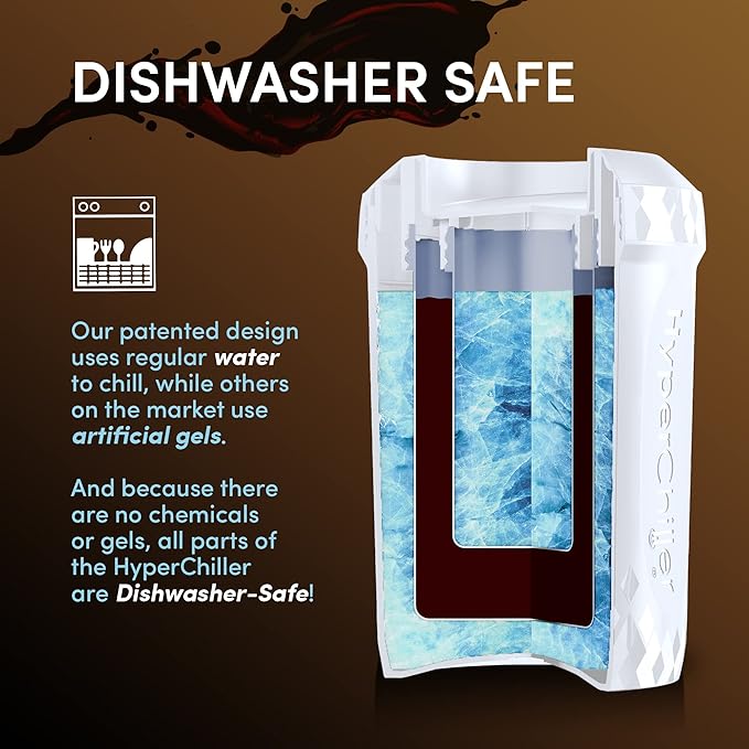 - IMPROVED V2 PRODUCT - the easiest, most cost effective way to chill your favorite beverages! Our Patented design uses regular water to chill and because there are no chemicals or Gels, all parts of the HyperChiller are dishwasher safe!