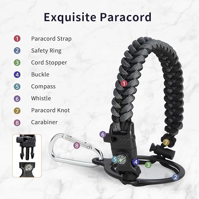 - Full-function Paracord: Brilliant paracord of matching colors bring out the bottle with a touch of youthful vibe. Compact compass and handy carabiner make the bottle the ideal survival kit for expeditions in the wild.