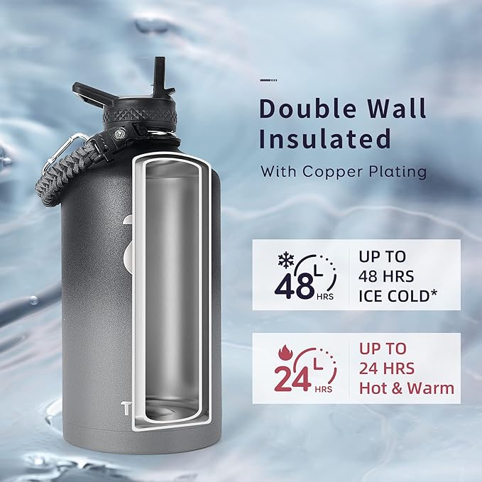 Trebo One Gallon Water Bottle Insulated with Paracord Handle,128oz Stainless Steel Sports Large Jug Food-grade Double Wall Vacuum with Straw Spout Handle Lids, Leakproof Keep Cold & Hot, Dark Gray