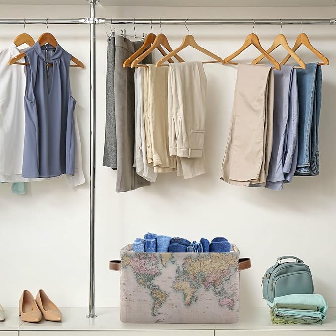 Vintage World Map Storage Basket Collapsible Laundry Organizer with Leather Handles Retro Map Print Rectangular Storage Box Bin 1 PC for Bathroom Clothes Kids Toys Nursery