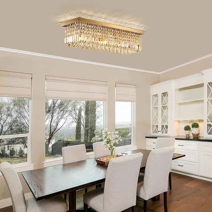 - â¨ăLuxury Gold Crystal Chandelieră: Luxury rectangular chandelier in elegant raindrop design combines modern & minimalist elements, which delivers a superior & high-class ambiance in any spaces. Perfectly matches many decoration styles like modern, classic, farmhouse, industrial, nordic, etc. Suitable for dining room, living room, kitchen island, hallway, entryway, bathroom, bedroom, etc.