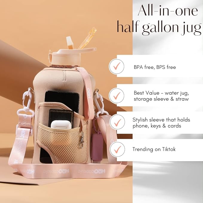 H2O Capsule 2.2L Half Gallon Water Bottle with Storage Sleeve and Removable Straw – BPA Free Large Reusable Drink Container with Handle - Big Sports Jug, 2.2 Liter (74 Ounce), Sandy Beige