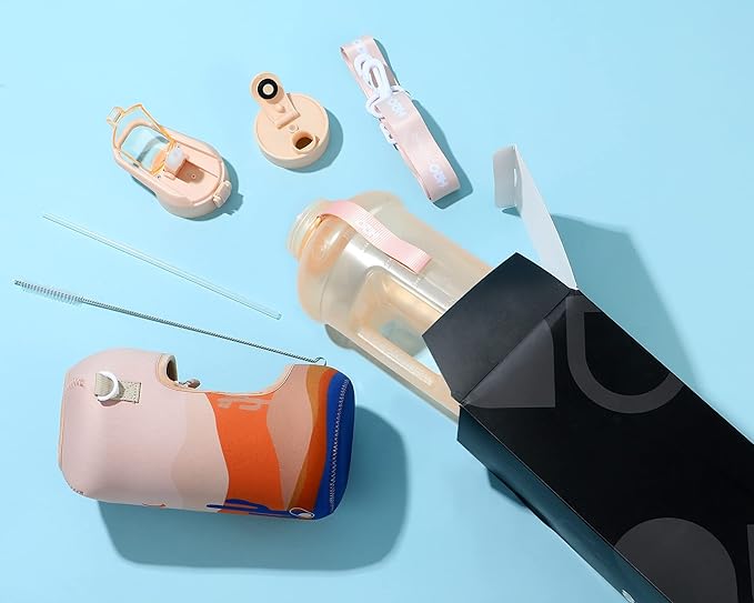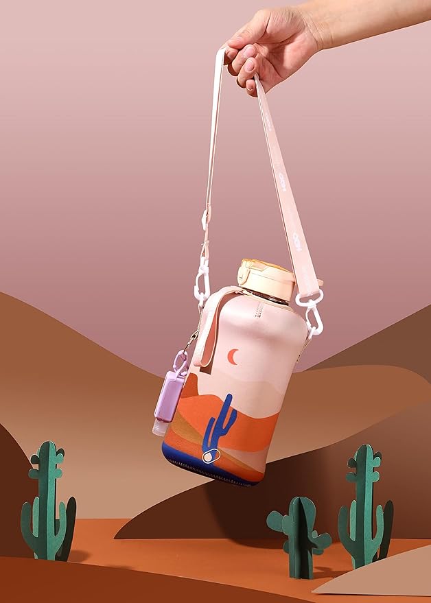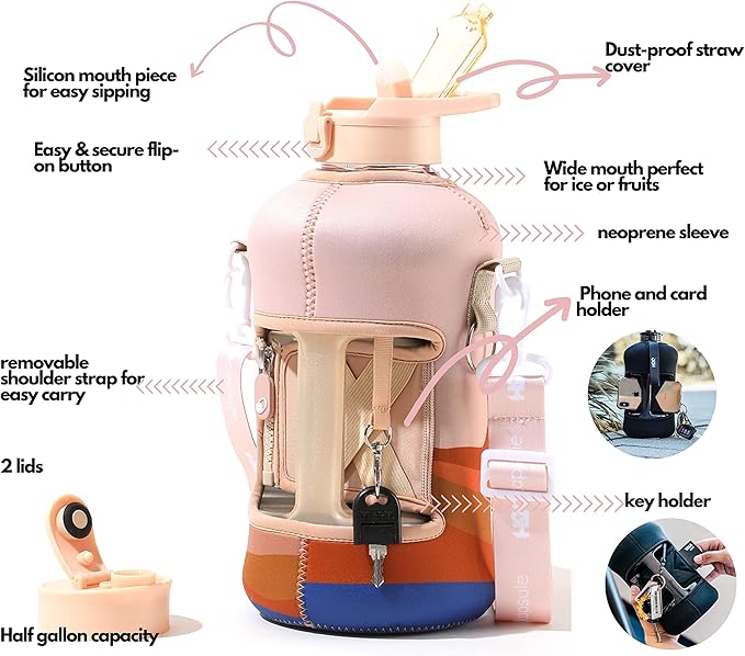 - UNIQUE STORAGE SLEEVE: Using the space under the large jug handle to store your stuff, the patent-pending removable thermal sleeve has a unique design that holds your cards and cell phone, and is finished with an in-built key chain and removable shoulder strap for convenient hands free carrying! It’s the only encased water jug that holds your things while you exercise.