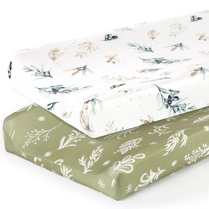GRSSDER Stretch Ultra Soft Jersey Knit Changing Pad Cover Set 2 Pack,Change Table Pad Covers Fit 32"/34" x 16" Pads Safe and Snug,Stylish Watercolor Flora and Olive for Baby