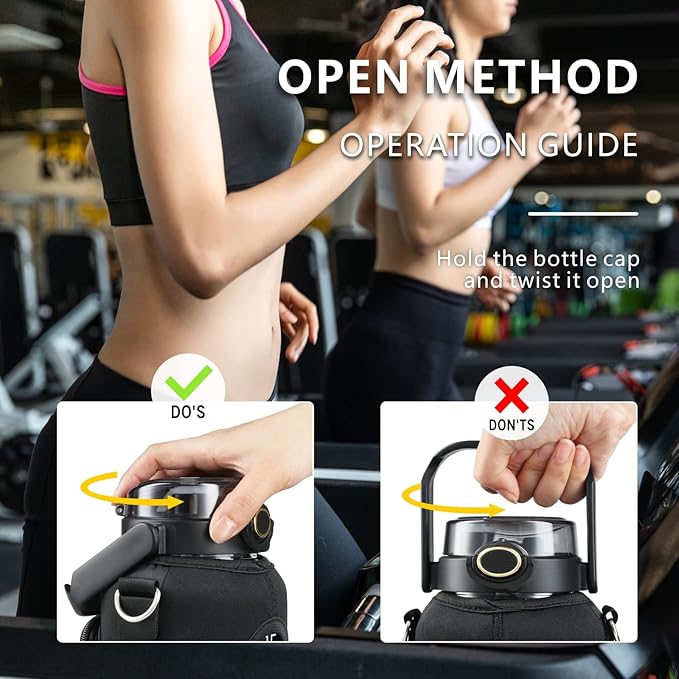 - Glass Water Bottle with Pop Up Lid : Our 42-64OZ glass water bottle with straw is designed with a pop up lid with silicone O-ring, secure lock & dust cover that ensures to be 100% leak-proof and dust-proof. This glass water bottle has two ways to drink water There's both a straw and a hole that can be drank from directly which is very convenient and fast