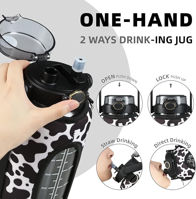 - Glass Water Bottle with Pop Up Lid : Our 42-64OZ glass water bottle with straw is designed with a pop up lid with silicone O-ring, secure lock & dust cover that ensures to be 100% leak-proof and dust-proof. This glass water bottle has two ways to drink water There's both a straw and a hole that can be drank from directly which is very convenient and fast