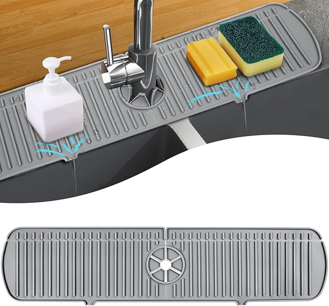 - 💪【MULTIFUNCTION】 It's not only a faucet drying mat, it also a sponge holder for kitchen sink, dish soap tray, dish drying mat. For kitchen: put sponge, dish soap, detergent, brush, and bottle on it. Upgrade the size of the increase, you can put more kitchen small things. Make your sink cleaner. Used as an organizer mat, drain pad. It is a super practical kitchen & bathroom gadgets.