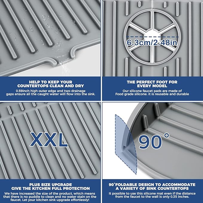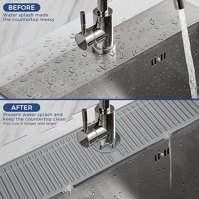 - 💪【KEEP YOUR COUNTERTOP DRY】 Silicone faucets pad new designed for faucet splash with the draining, upgrading your kitchen sink & bathroom countertop in an effort-saving way! This means never gets soggy, or any water spots by the faucet. You don't need to worry about the water staying on the mat or counter.