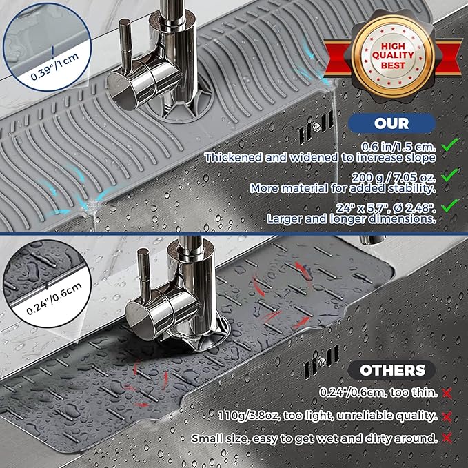 - 💪【XXL PLUS SIZE】 XXL Size: 24"(61cm) x 5.55"(14.1cm) , Ø 2.48"(6.3cm) Diameter single faucet hole. Unlike other products, we have increased the size and weight of our products. XXL super size design for faster, smoother drainage and faster drying. Upgraded supersize, wider space protection, this means no puddles to clean up & no water spots by the faucet. Give your kitchen sink an effort-saving upgrade!