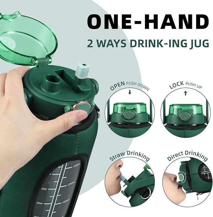 - Glass Water Bottle with Pop Up Lid : Our 42-64OZ glass water bottle with straw is designed with a pop up lid with silicone O-ring, secure lock & dust cover that ensures to be 100% leak-proof and dust-proof. This glass water bottle has two ways to drink water There's both a straw and a hole that can be drank from directly which is very convenient and fast