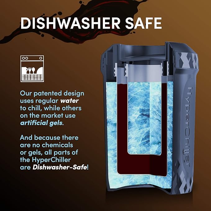 - IMPROVED V2 PRODUCT - the easiest, most cost effective way to chill your favorite beverages. Our Patented design uses regular water to chill and because there are no chemicals or Gels, all parts of the HyperChiller are dishwasher safe