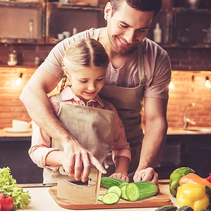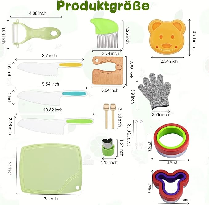 - 🌞What's included in the set: You will receive 1 piece wooden kids knife, 3 large sandwich cutters, 3 pieces different size / color serrated edges toddler knives, 1 * children kitchen glove, 1 pieces potato slicers knife, 6 * fruit cutters shapes, 1 * Y peeler, 1 * cutting board and 20*fruit fork picks, 2 * cleaning brush etc. A variety of toddler knives can increase the fun of children's kitchen play.