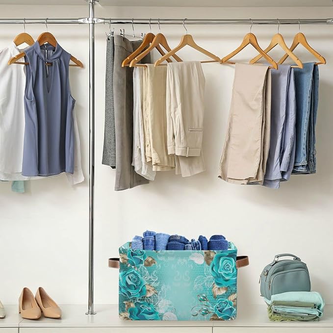 Wamika Turquoise Blue Green Rose Storage Basket Fabric Laundry Baskets Spring Flowers Leaves Storage Boxes Organizer Bag for Baby Cloth Dog Toy Book Storage Cubes Shelf Closet Bins 16x12x8 Inches