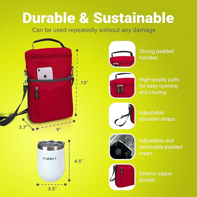 meori 2-Bottle Insulated Wine Tote + Tumbler Set with Lids Bundle Gifts for Wine Lover Women | Hibiscus Red