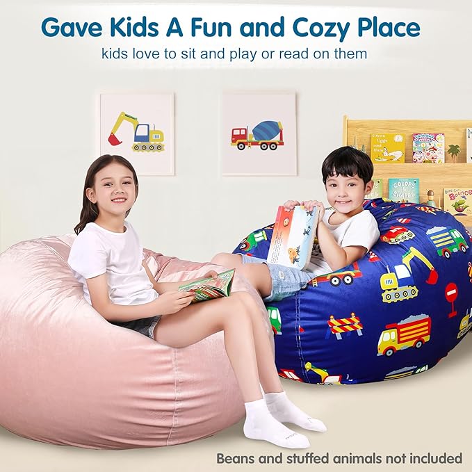 Lukeight Stuffed Animal Storage Bean Bag Chair Cover for Kids, Zipper Beanbag Chair Cover for Organizing Toddler and Kids' Rooms Plush Toys (Excavator Velvet, X-Large)