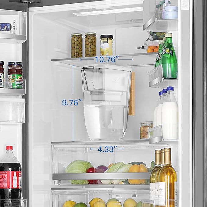 - [Net Water Volume & Size]: The BPA-free filter water pitcher with filter holds 10 cups 150 Gallons of filtered water, which is enough to fill three 24-ounce reusable water bottles, providing you with 640 cups of excellent water, healthy and purified water. you may clean your drinking water for a longer period of time. The water filtration pitcher (10.76''x 4.33''x 9.76'') shape is ideal for refrigerator shelves.